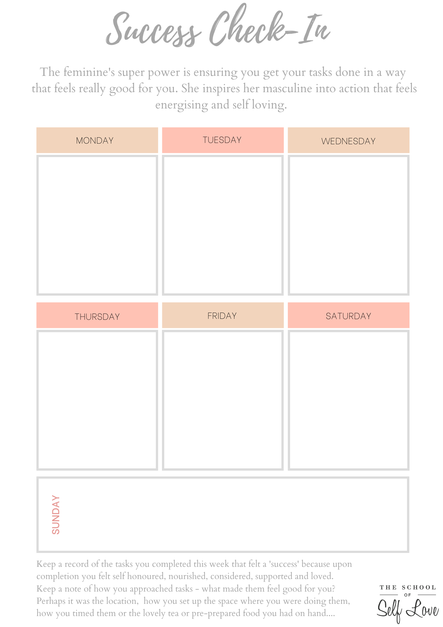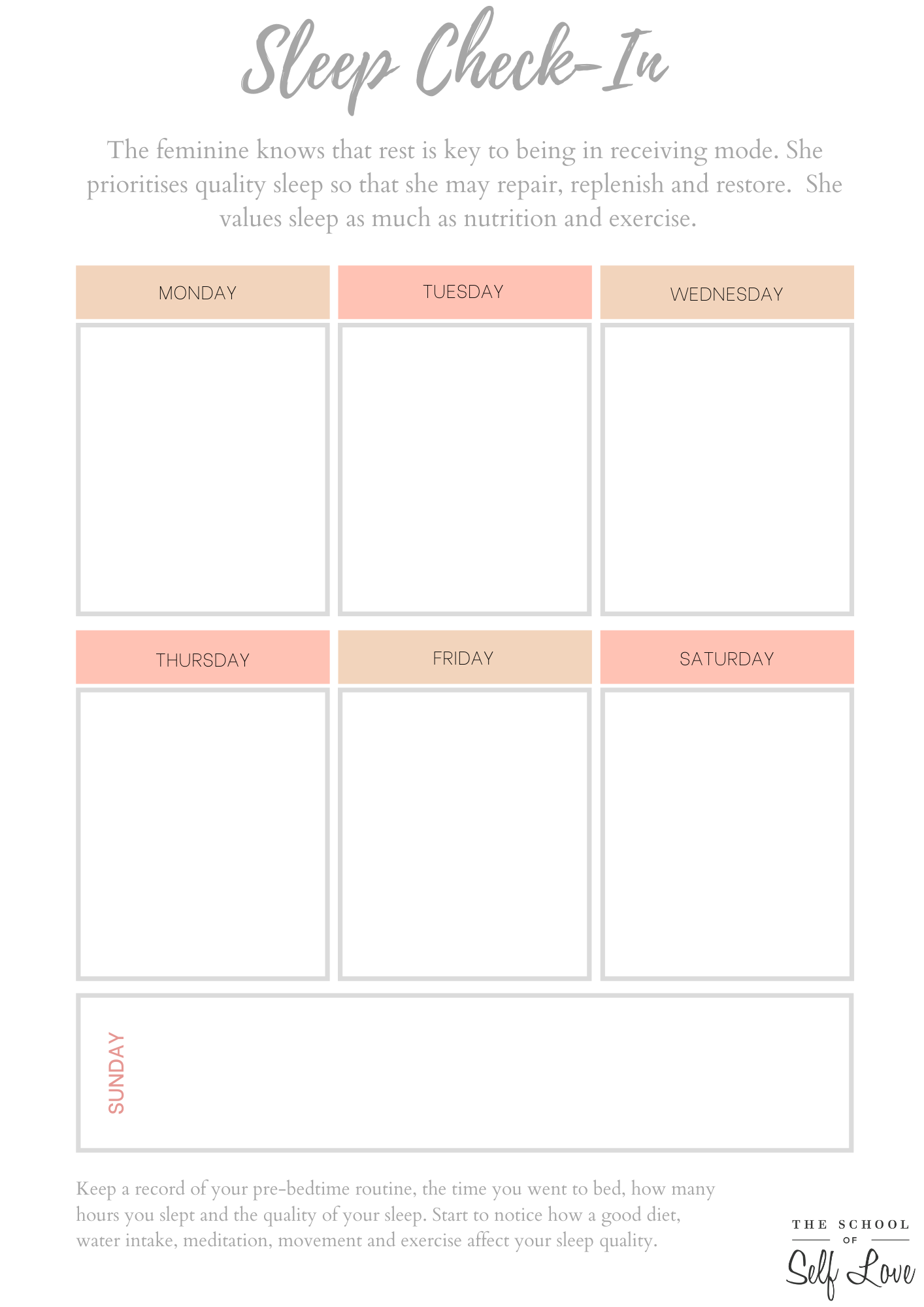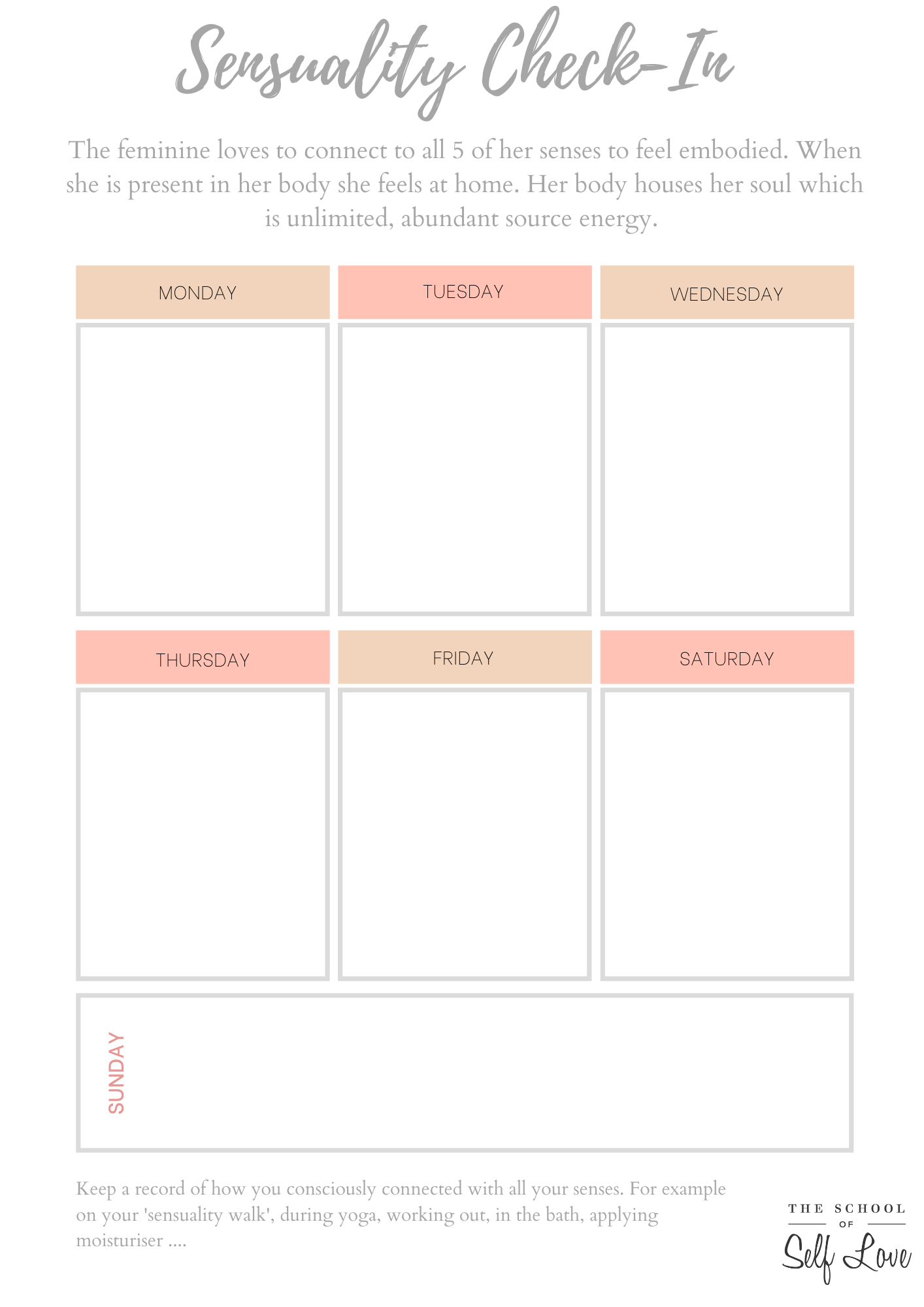 I have created these 'check-in' sheets for you so that you may stay conscious to how you can support your feminine energy and take care of yourself with self love every day.